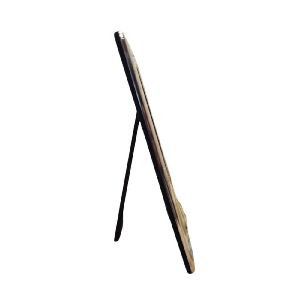 Photo frame. Horizontal. Size: 17 x 12 cm. Made by: Mascagni Casa (Italy). Color: silver. The back side of the frame is framed with black velour. On the frame: a small bear sleeping on the moon.