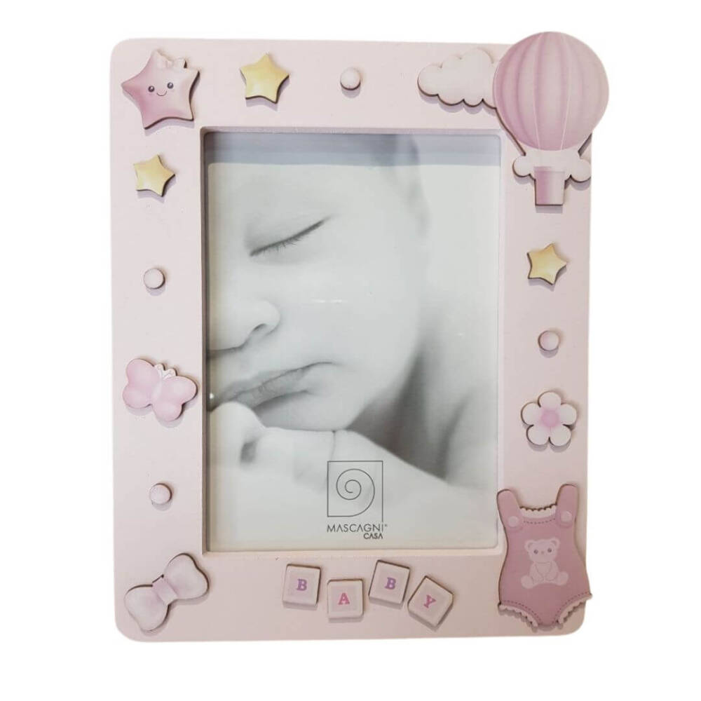Photo frame. Vertical. Size: 12 x 17 cm. Made in: Mascagni Casa (Italy). Color: pink (for girls). On the frame: the inscription "Baby", stars, flowers, butterflies, bows, balloon. The back of the frame is framed with black velour.